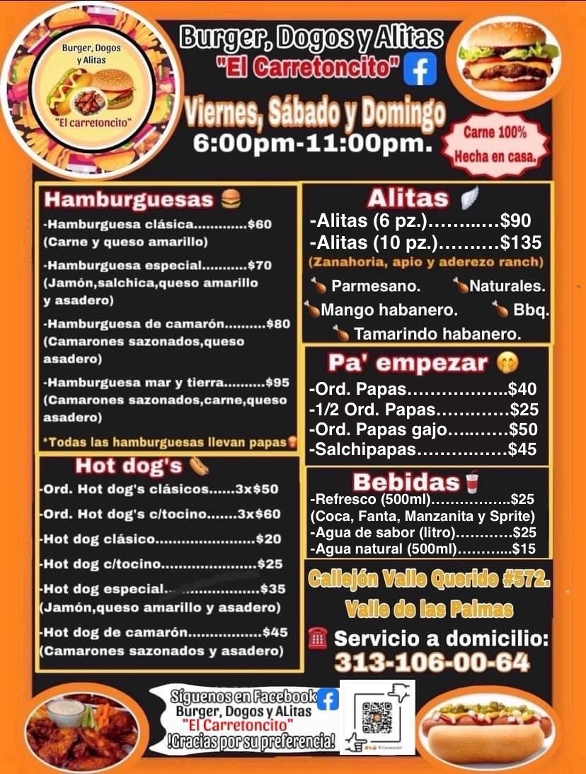 Burger, Dogos y Alitas “El Carretoncito” is a restaurant located in Tecomán, Colima, specializing in a diverse menu of burgers, hot dogs, and wings. Situated at Calle Cjon. Valle Querido 572 in the Valle Querido neighborhood of the Valle de las Palmas area, this establishment is known for its welcoming atmosphere and personalized service. It is an ideal destination for those seeking a quick and tasty dining experience, offering classic American dishes with a local twist. Although it currently has limited online reviews, its dedication to quality and flavor makes it a notable culinary spot in the region. Customers can contact the restaurant at 313 106 0064 or visit their Facebook page for more information or to place orders. This restaurant is a great choice for casual dining in Tecomán, providing a balanced combination of taste, price, and service.