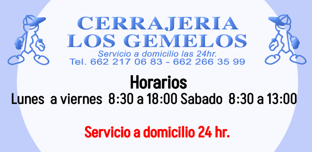 Cerrajería los Gemelos — Cerrajero Ubicado en Hermosillo. Horario: lunes: Abierto 24 horas; martes: Abierto 24 horas; miércoles: Abierto 24 horas; jueves: Abierto 24 horas; viernes: Abierto 24 horas; sábado: Abierto 24 horas; domingo: Abierto 24 horas | Calificación: 4.3 (108 opiniones)