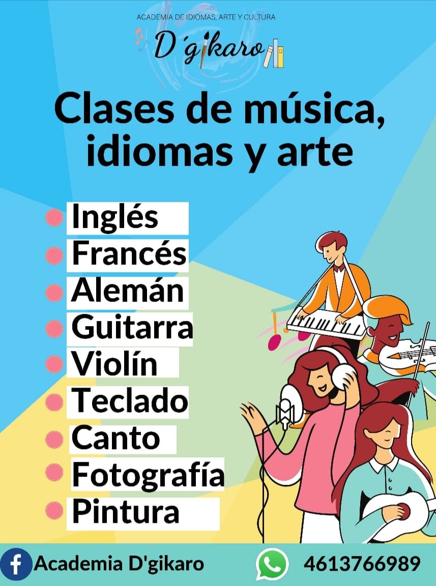 D’gikaro Academia de arte y cultura — Escuela De Arte Ubicado en Celaya. Horario: lunes: 16:00–20:00; martes: 16:00–20:00; miércoles: 16:00–20:00; jueves: 16:00–20:00; viernes: 16:00–20:00; sábado: 10:00–14:00; domingo: Cerrado | Calificación: 5 (12 opiniones)