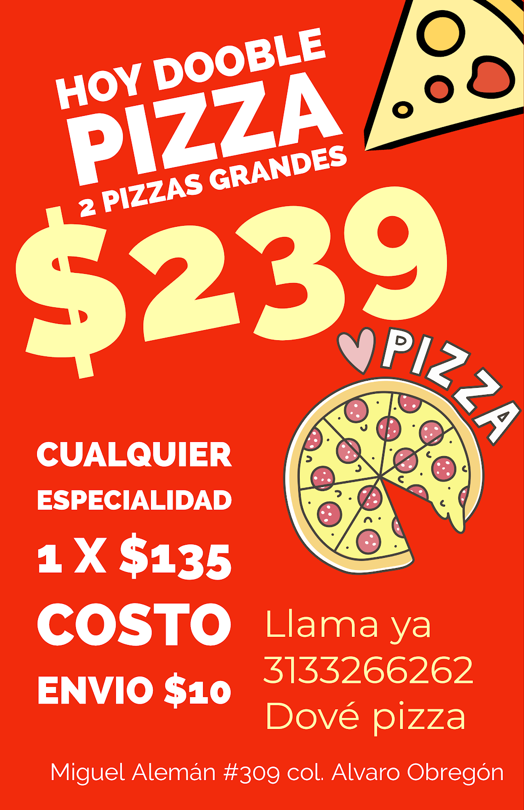 Dove Pizza es una pizzería emblemática ubicada en Miguel Alemán 308, Álvaro Obregón, en el corazón de Tecomán, Colima. Con una trayectoria destacada en la región, esta pizzería se ha consolidado como una de las primeras opciones para quienes buscan disfrutar de una pizza deliciosa, recién salida del horno. Su reputación se basa en la calidad de sus ingredientes, el sabor auténtico y un servicio rápido que satisface tanto a locales como a visitantes. Los clientes valoran especialmente la experiencia acumulada a lo largo de los años, que se refleja en cada platillo, así como los precios accesibles que hacen de Dove Pizza una alternativa atractiva para toda la familia. Aunque algunos clientes mencionan que podrían incluir más opciones de salsas, como el chimichurri, la mayoría coincide en que la calidad y el sabor son sobresalientes. Además, su ubicación estratégica en Tecomán facilita el acceso para quienes desean una comida rápida y sabrosa en un ambiente acogedor. Para más información o realizar pedidos, se puede contactar al teléfono 313 326 6262 o visitar su perfil en https://directoriocolima.com.