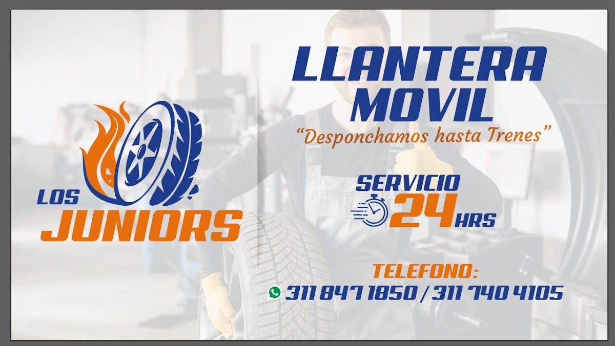 Llantera Móvil Los Junior’s — Llantera Ubicado en Tepic. Horario: lunes: Abierto 24 horas; martes: Abierto 24 horas; miércoles: Abierto 24 horas; jueves: Abierto 24 horas; viernes: Abierto 24 horas; sábado: Abierto 24 horas; domingo: Abierto 24 horas | Calificación: 5 (15 opiniones) Sitio web: https://www.instagram.com/llantera._losjuniors?igsh=MXQ2NmgzOXlyNGdzdg==&utm_source=qr