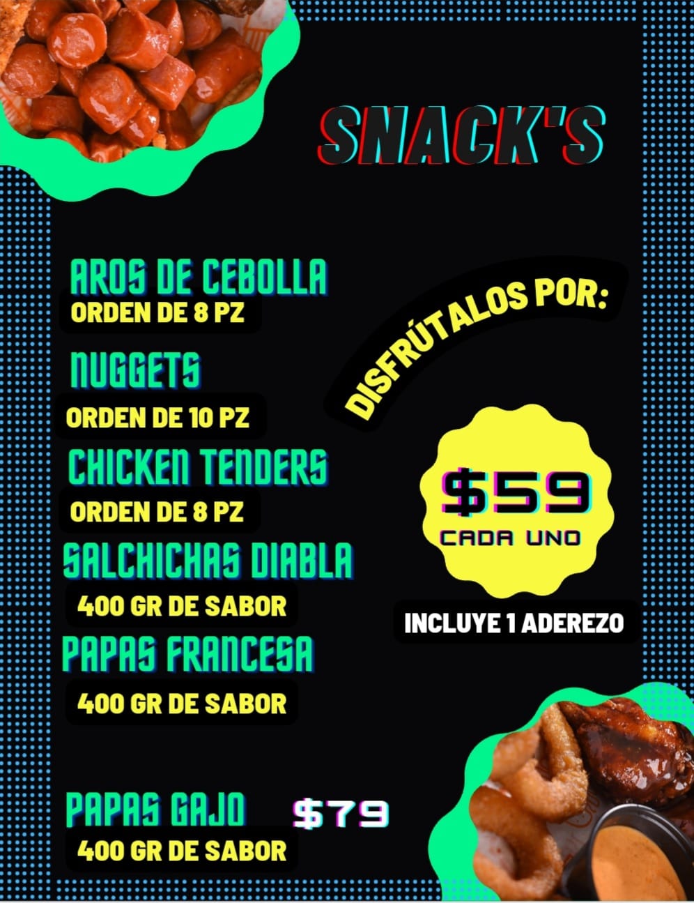 Mr Snack Wings is a restaurant located in Colima, specializing in a variety of wings and snacks designed to satisfy customers’ cravings. Located at Av de los Insurgentes 944, INFONAVIT Camino Real, this establishment offers both takeout and meal delivery services, making it convenient for customers to enjoy their favorite dishes from home. Mr Snack Wings is dedicated to maintaining high-quality standards in every preparation, blending traditional flavors with innovative options to cater to diverse tastes. Although it is a local point of interest with no Google reviews yet, the restaurant focuses on customer service and prompt delivery, making it a reliable choice for those seeking quick and tasty meals in Colima. For more information and orders, customers can call 312 200 1569 or visit their official website.