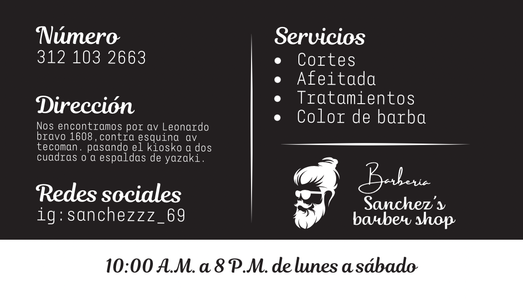SANCHEZ’S BARBER SHOP, ubicado en Av Tecomán 1608, Colima, es un punto de referencia para el cuidado del cabello y la salud capilar en la región. Con una calificación perfecta de 5 estrellas basada en las opiniones de clientes satisfechos, este establecimiento se destaca por ofrecer servicios profesionales y personalizados que garantizan una experiencia de alta calidad. Su equipo de barberos expertos utiliza técnicas modernas y productos de primera para asegurar que cada cliente reciba un tratamiento adecuado a sus necesidades. Además, su ambiente acogedor y atención al detalle hacen que cada visita sea placentera y confiable. Para reservas y consultas, puede comunicarse al 18005556677 o visitar su perfil oficial en Instagram en https://www.instagram.com/sanchezs_barber69?igsh=MThwa21kdzhoZWlxMA==&utm_source=qr. SANCHEZ’S BARBER SHOP es una opción ideal para quienes buscan un servicio de barbería profesional en Colima, combinando salud capilar y estilo en un solo lugar.